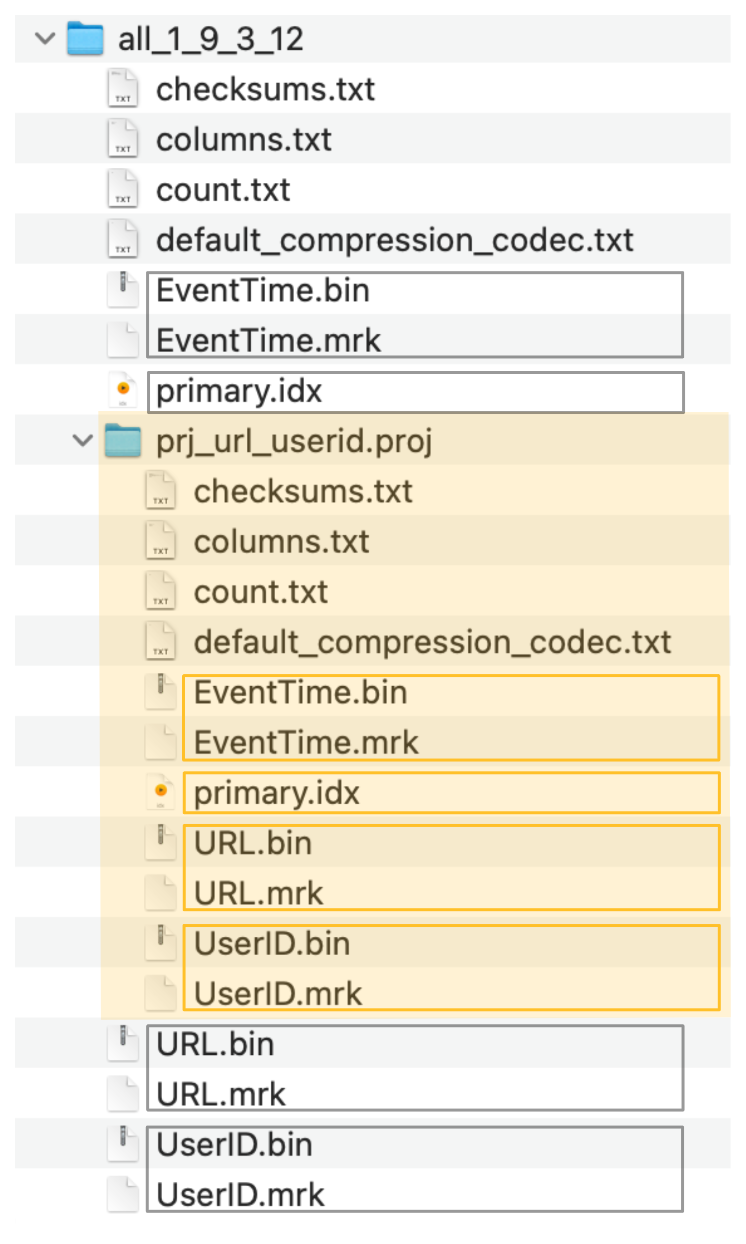 The following diagram shows the three mark files UserID.mrk, URL.mrk, and EventTime.mrk that store the physical locations of the granules for the table’s UserID, URL, and EventTime columns.